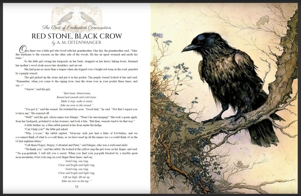 Enchanted Conversation magazine has recently been reborn in a new and utterly gorgeous format as a web magazine under the name The Fairy Tale Magazine. I was honoured by having one of my stories that EC had published in 2018 included in the “Best of Enchanted Conversation” section in the March edition, which is now out. So “Red Stone, Black Crow” is now available to read in the illustrious company of 70(!) pages worth of original fairy tale stories, with stunning illustrations that Amanda Bergloff created from public domain art (mine got an Arthur Rackham image! I mean, Arthur Rackham!). Check it out – it’s well worth the price of US$5.99 for the issue, or even better, $16 for the whole year (4 issues). (Also, the mag features an ad for Martin Millerson – how cool is that, an ad for my book in a real magazine!)